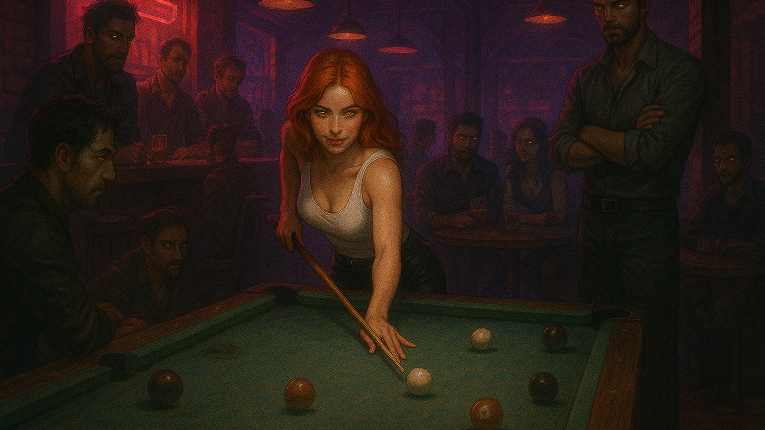 Mon doigt tapote la boule blanche, et les rires grondent, lourds de désir. La tension monte, électrique, et tu sens ton sang bouillir, tes griffes prêtes à jaillir. D’un mouvement joueur, presque inconscient, je fais tomber un verre sur une table voisine, le liquide éclaboussant le sol dans un éclat scintillant.